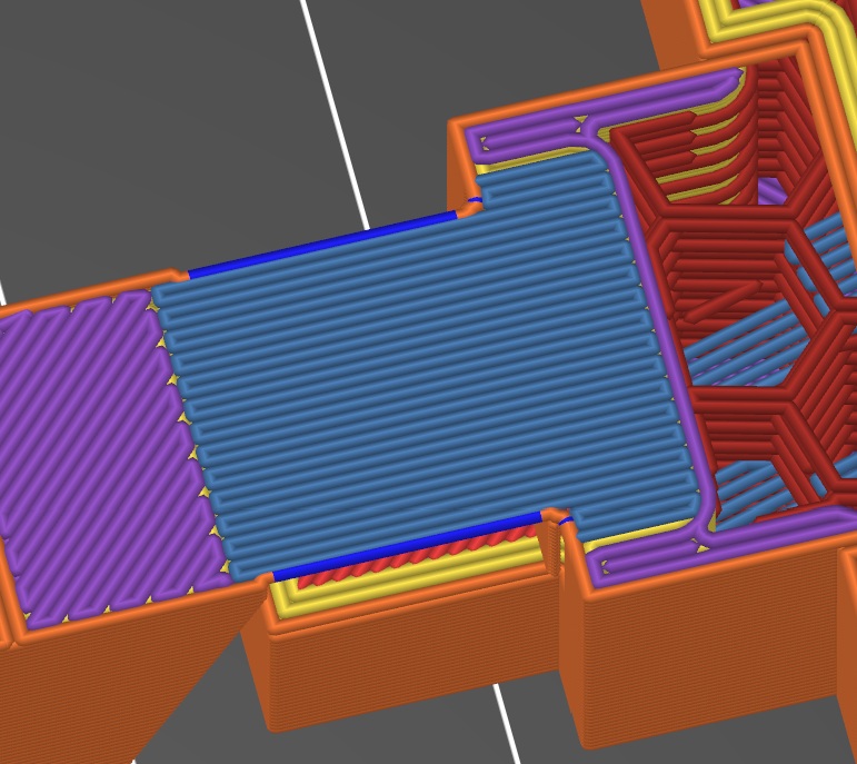 In this picture, Multiple profiles cause the ends of bridging moves to not overlap or connect well on the left side. The bridging moves only connect on the sides on the left. This ends up in a birds nest appearance after printing since many bridging ends on the left do not attach. To get the bridging to work as shown above, the 3 perimeter setting was changed to a single perimeter for the bridging layer only.