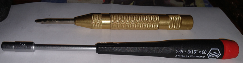 The top tool below is an automatic center punch. Designed to put small divot in a piece of metal. An internal spring and hammer mechanism is loaded as you push down. Push far enough and pop. As if you hit it with a hammer and leaves a small mark. Works well. It also works to set small rivets that have a hollow tip.