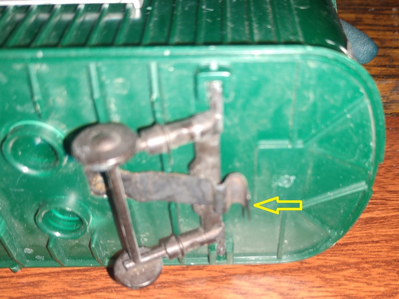On to a more modern 16330 trailer. These trailers have a 6mm or 1/4" hole for the "king pin". There is a small hole .125" or 3mm hole in the center along with the .4"/10.16mm hole for the truck rivet on both ends of the trailer. I decide to use these holes for orientation. Also to press fit into the truck rivet hole to hold the mount in. No glue no fuss. If you want to remove it later, just pull it out with a little force.
