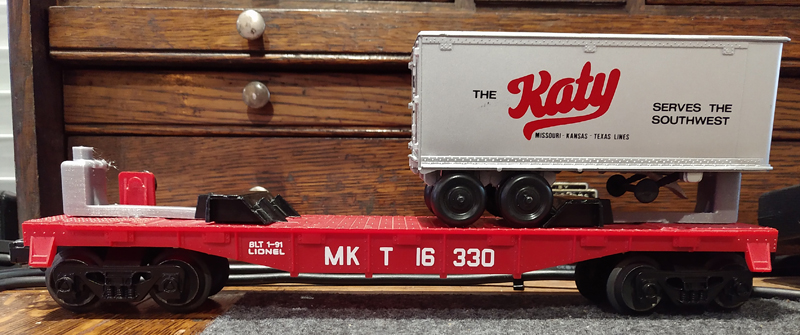 Lionel flat cars with trailers need bands or something to hold trailers on. When I saw trains with trailers growing up, they often had a 5th wheel connection on the flat cars . I didn't want any bands holding the trailers on. This became a 3D printer project.